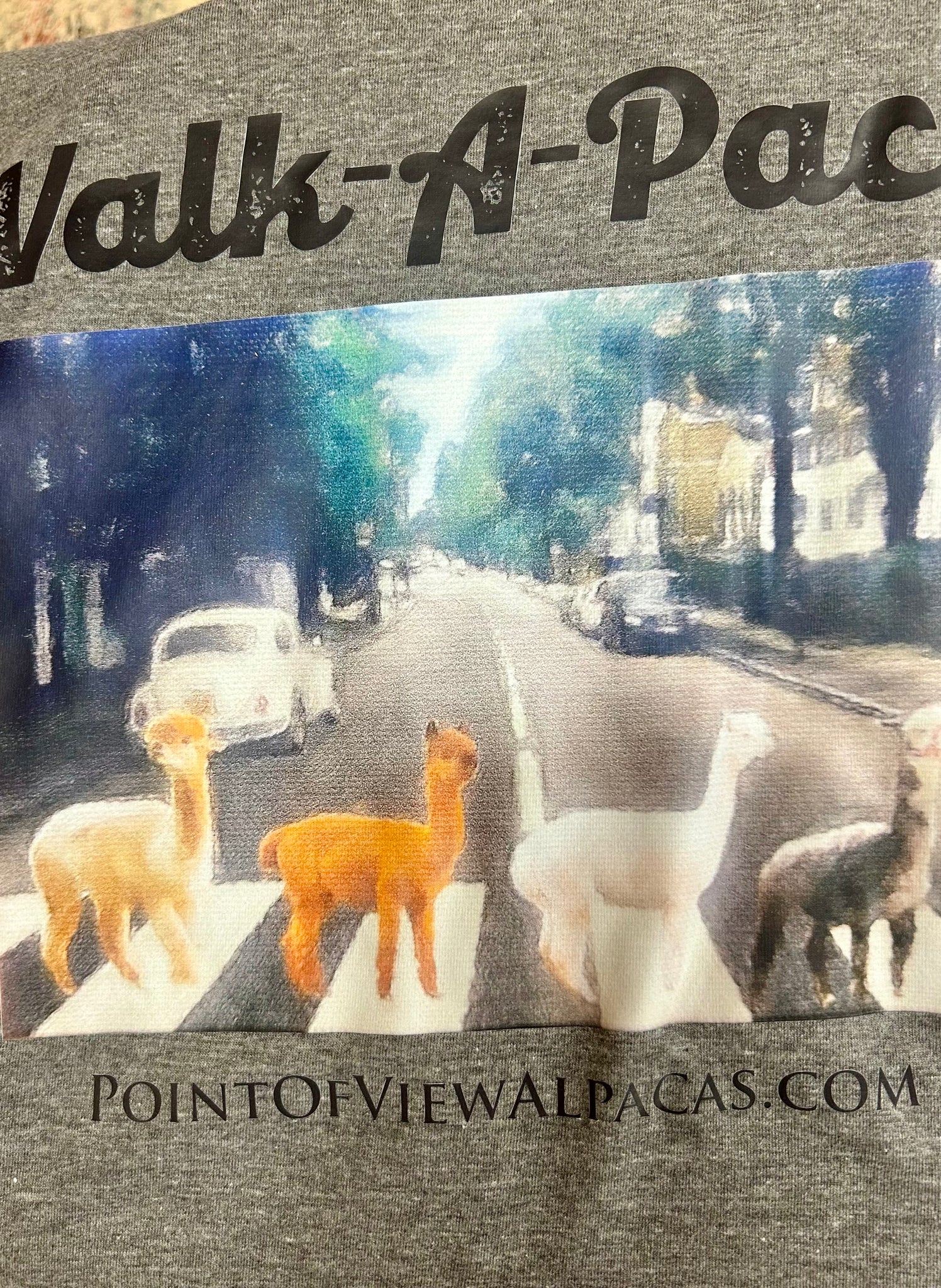 Long sleeve T-shirts highlighting the very popular Walk-a-Paca experience at Point of View Alpacas farm in Mt. Sidney, VA.
